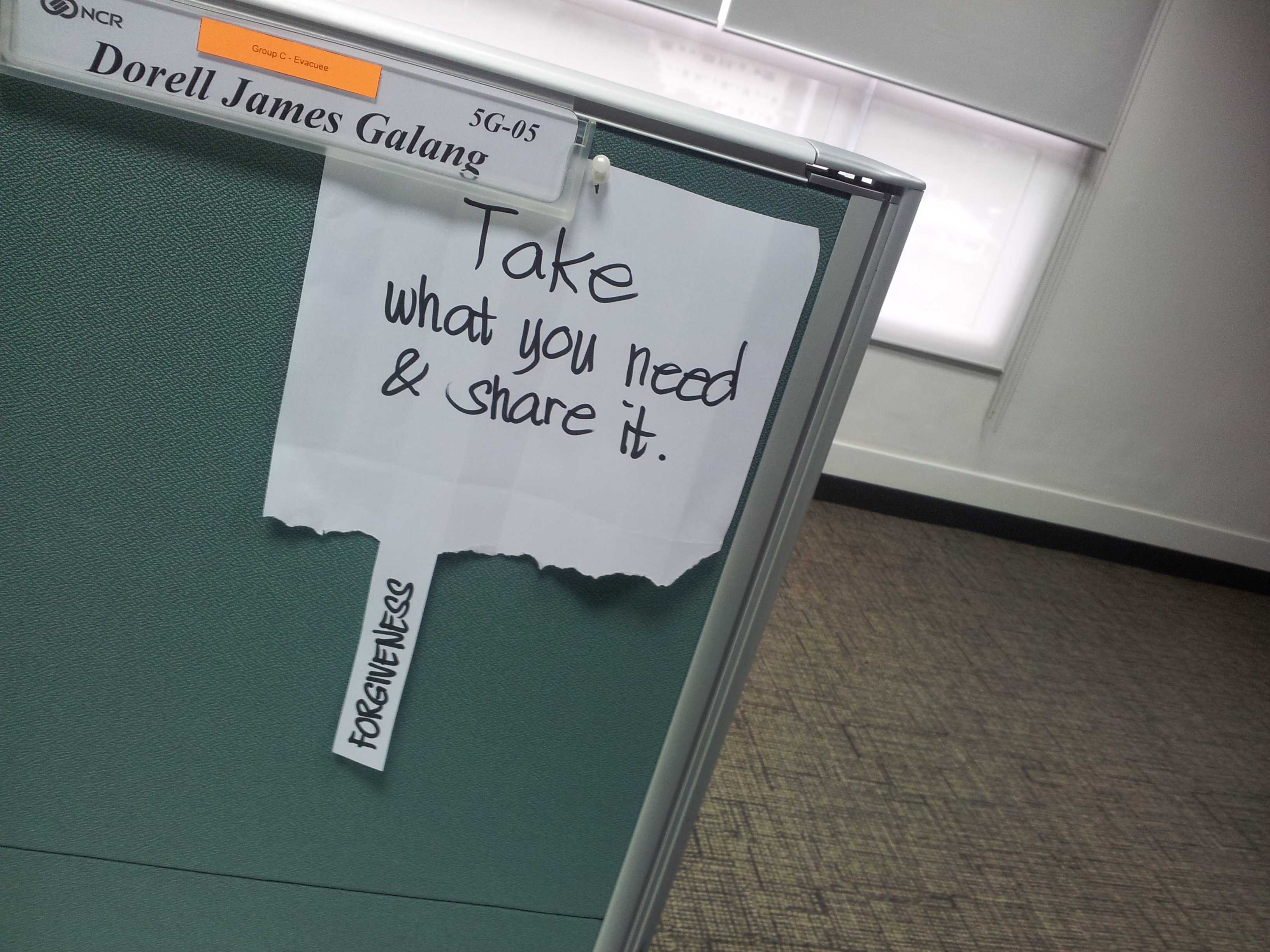 Earlier this year, I made this kind of thing where I wrote some words arranged vertically on a piece of paper and cut in between each word so as it would be easily grab by anyone and put it on my cubicle where people could easily see it and grab them. The original idea came from a post in Google+ and it was just simply about “taking what you need” but then I realize that it would be better that if they take one, why not share it? They might not be the only one who needs it at the moment, right? Or they’ll be some other one who’ll need it in the future. And so I added the the words, “share it“, making it “Take What You Need & Share It” as shown in the picture.